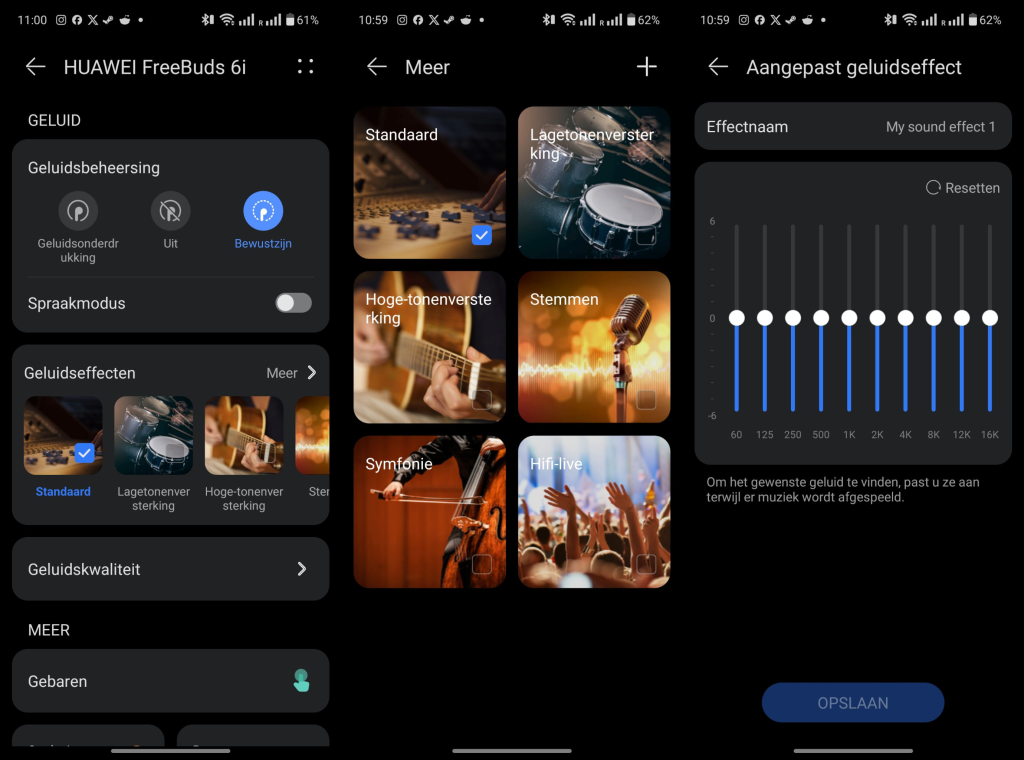 Met grote drivers leveren de FreeBuds 6i een helder en gebalanceerd geluid, inclusief voldoende bas. In de AI Life app zijn er diverse geluidseffecten beschikbaar, zoals hoge-tonen en lage-tonen versterking. Gebruikers kunnen ook hun eigen geluidsvoorkeuren instellen met een EQ.